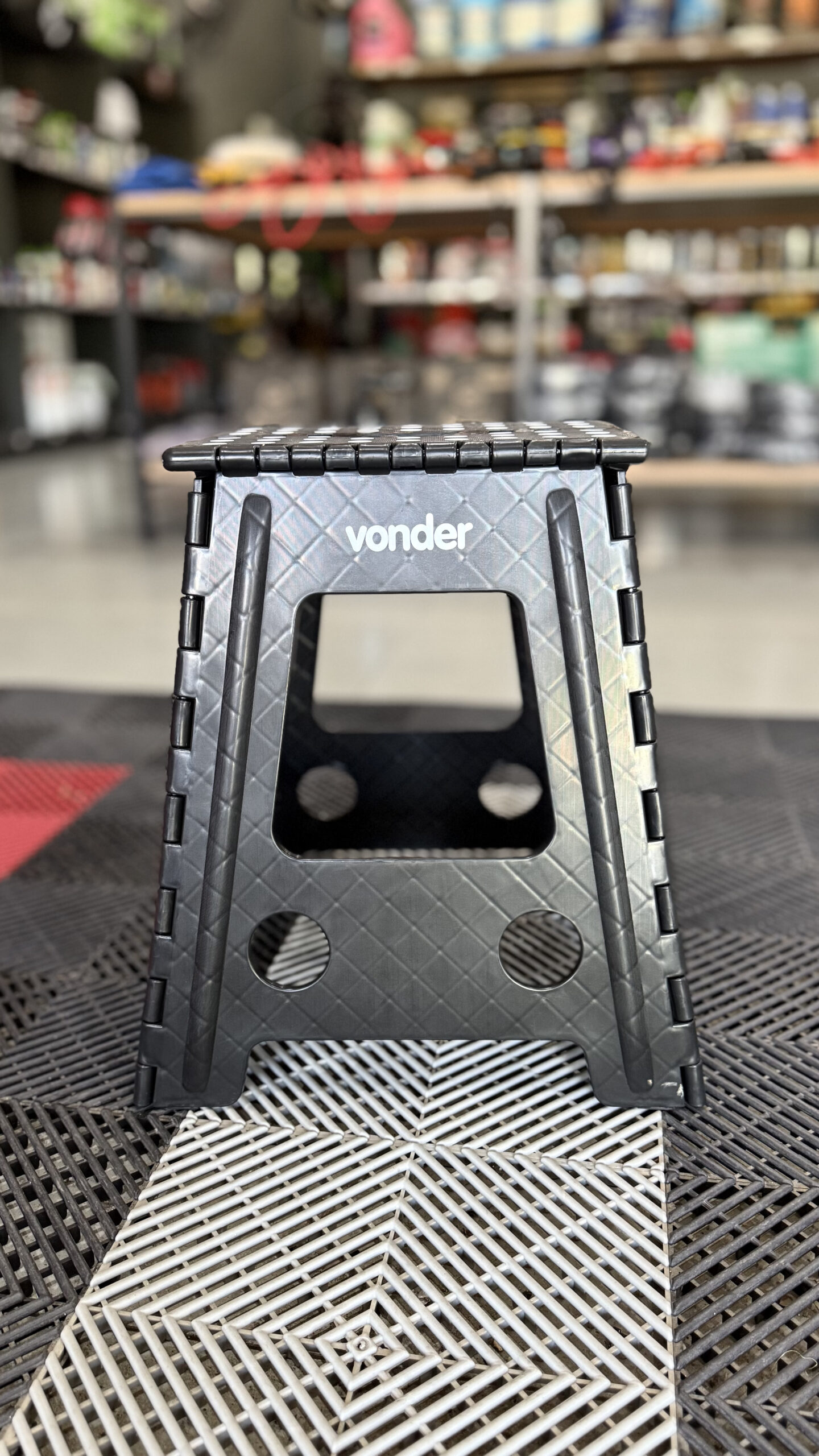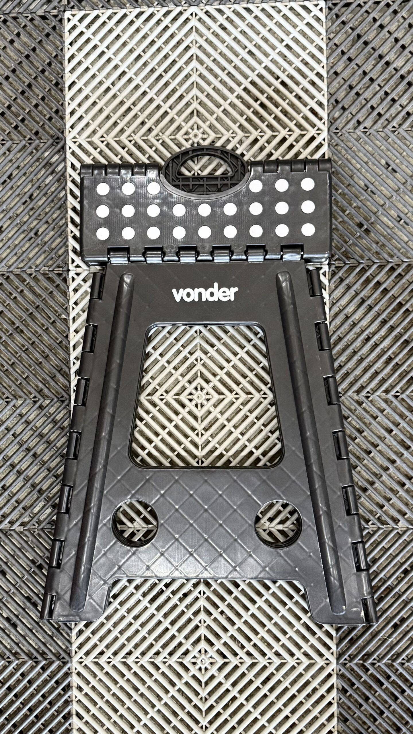Antiderrapante, dobrável e com alça para transporte (fechada). Estrutura reforçada e com encaixes com parafusos de reforço.
