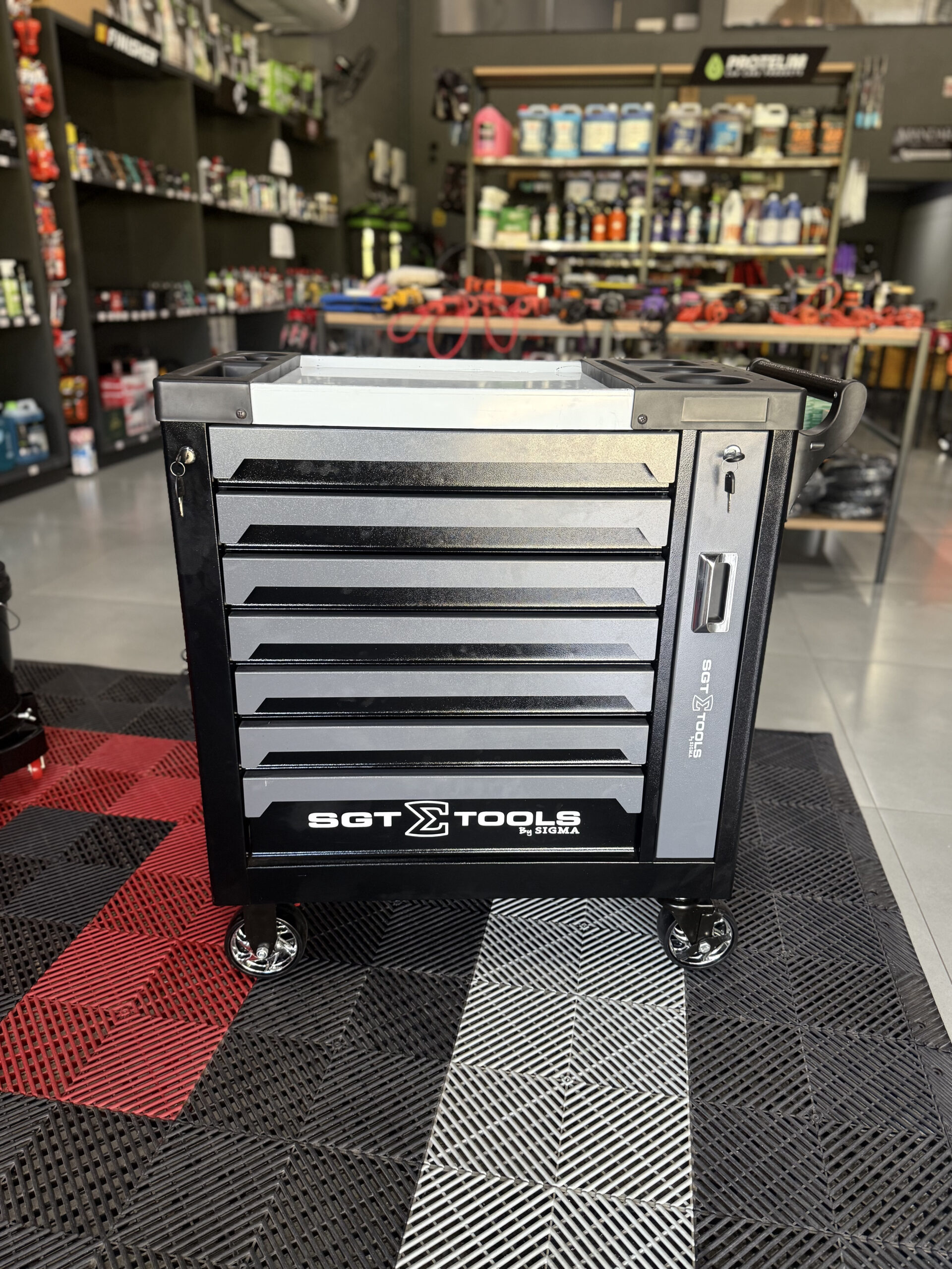 Carrinho profissional de alta resistência projetado para organização e mobilidade de ferramentas, com sistema de gavetas múltiplas e rodízios com travamento para máxima praticidade em ambientes de trabalho.
