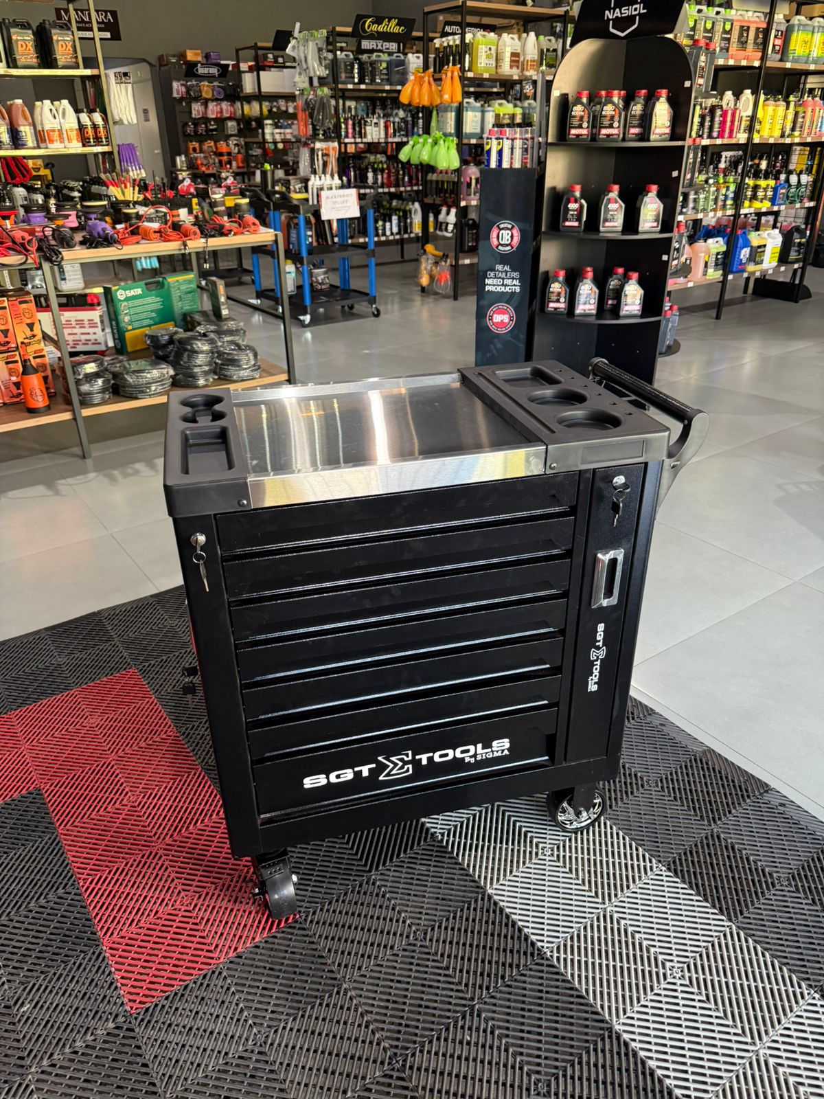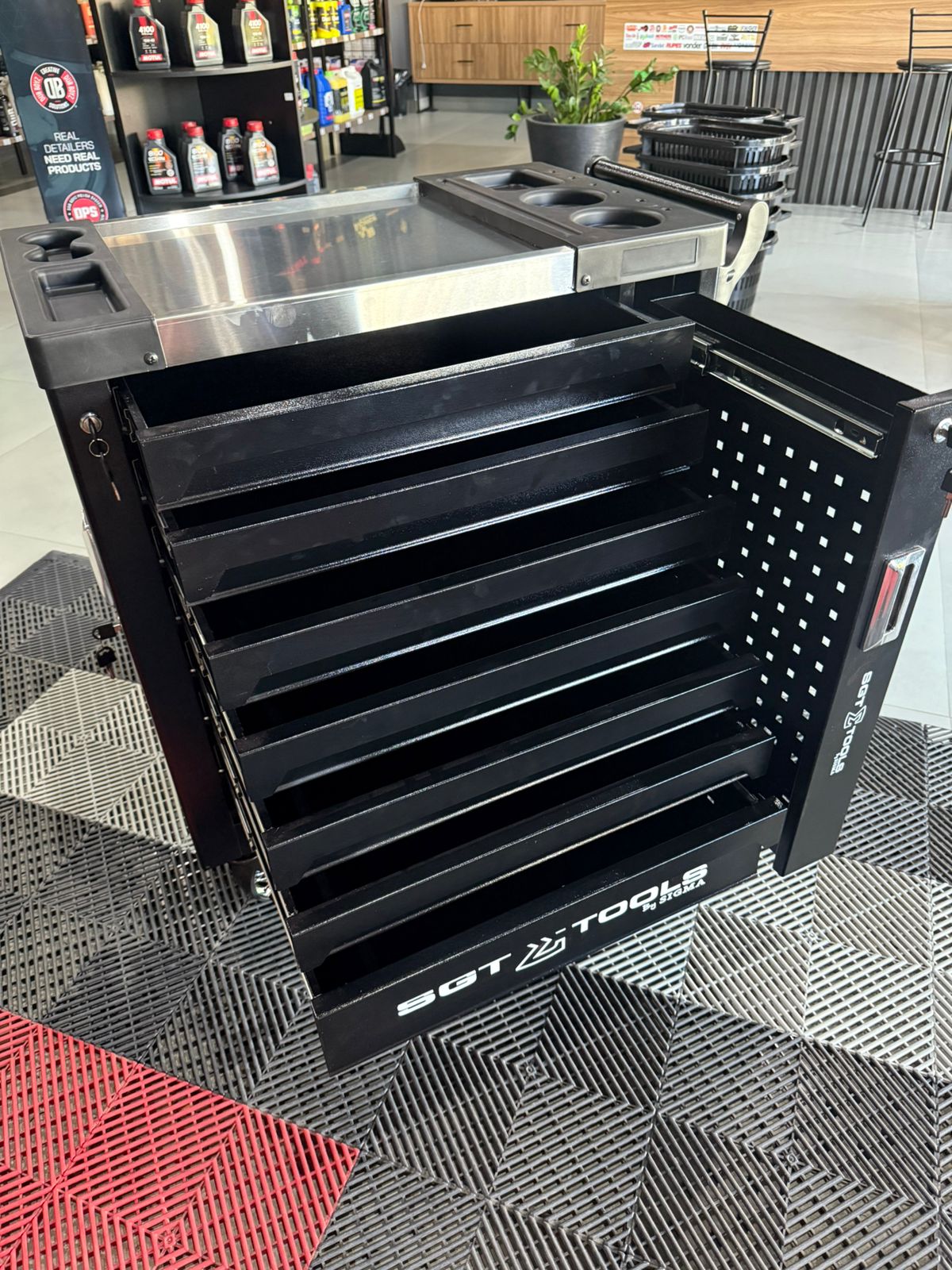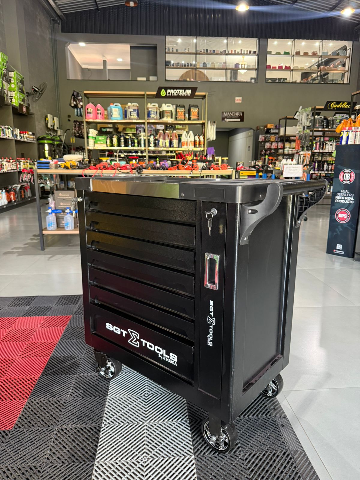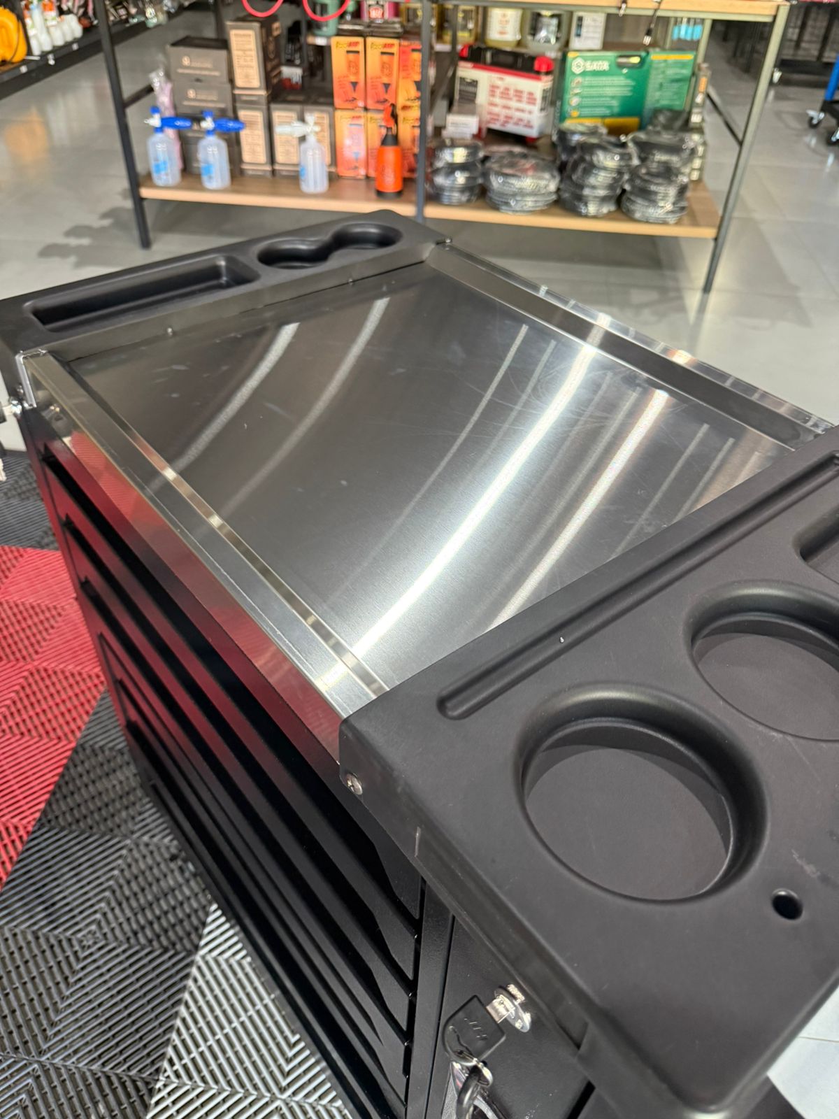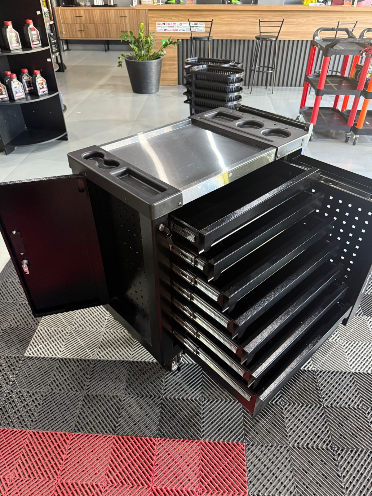 Carrinho profissional de alta resistência projetado para organização e mobilidade de ferramentas, com sistema de gavetas múltiplas e rodízios com travamento para máxima praticidade em ambientes de trabalho.